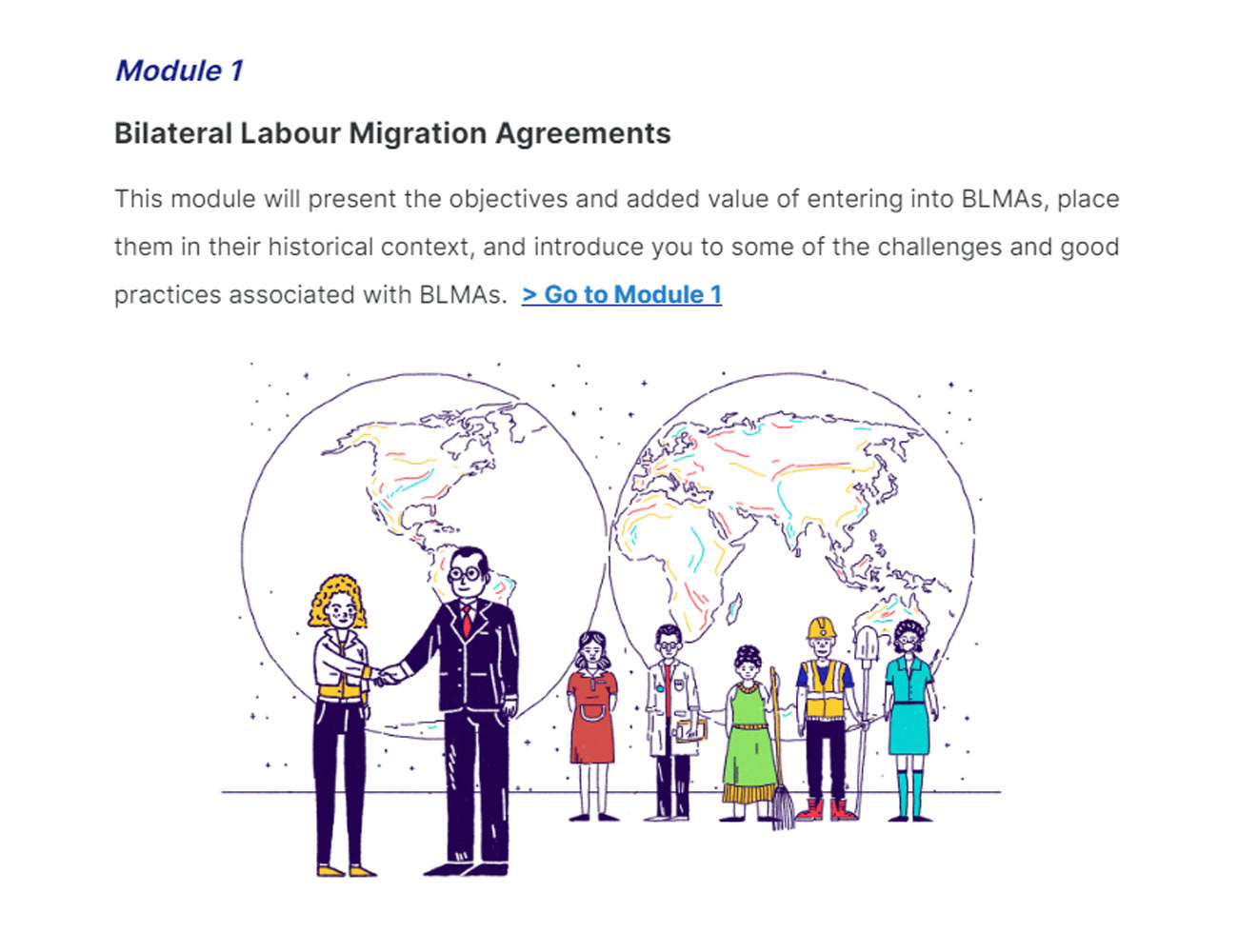 Colaboración junto a ITCILO (International Training Centre of the ILO) donde desarrollé un paquete de ilustraciones que acompañan a los módulos del proyecto. Basándose en las experiencias de la OIT en la prestación de apoyo técnico y asesoramiento sobre migración laboral a gobiernos, comunidades económicas regionales y otros socios, este conjunto de herramientas tiene como objetivo brindarle orientación práctica sobre el desarrollo y la implementación de acuerdos bilaterales efectivos sobre migración laboral para mejorar la gobernanza de la mano de obra, flujos migratorios, fortalecer la protección de los trabajadores migrantes y garantizar que la contratación y colocación internacional responda a las necesidades del mercado laboral.